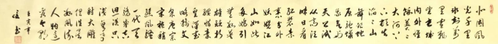 然而,他作书法亦可以从大处落笔,在小处收拾,笔墨交代的相当清楚,绝不含糊!所以其书法在痛快淋漓的表现中绝不粗糙,必有细腻的精心调适。牵丝映带,写得飞空妙秘!左右摆拔,如惊雷驰电。亦如激楚浪以成文,如蛇之透水,在飘风骤雨惊竦竦的浩莽情景里,也可观见得落花飞雪何茫茫的诗韵意象!所以观赏他的书法,可见侠者舞剑低旋转回旋之壮观,亦有鸾凤徘徊之飞仪。刚柔相济,笔墨调和,铁点银钩,锋须往来!